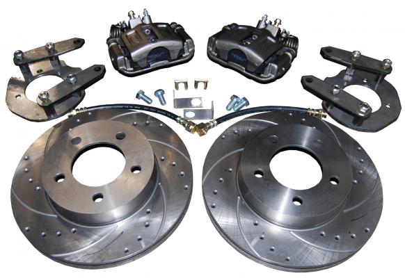 1963-69 RIVIERA REAR DISC BRAKE KIT - DIRECT BOLT ON. COMES COMPLETE WITH ROTORS, LOADED CALIPERS, BRACKETS, HOSES AND HARDWARE. UPGRADED ROTORS SHOWN.