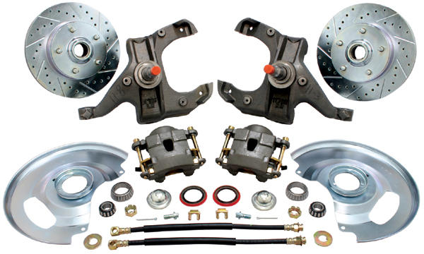 THIS KIT GIVES YOU DISC BRAKES AND EITHER STOCK HEIGHT OR DROP SPINDLES. DROP SPINDLES ARE 2 1/2" DROP. KIT INCLUDES: SPINDLES, 12" ROTORS, CALIPERS, BEARINGS, SEALS, HOSES & ALL NECESSARY HARDWARE. THESE NEW SPINDLES ARE DESIGNED TO WORK WITH YOUR STOCK TIE RODS AND BALL JOINTS. 5 LUG UPGRADED ROTORS SHOWN. THIS ITEM HAS AN ADDITIONAL OVERSIZE SHIPPING CHARGE OF 20.00