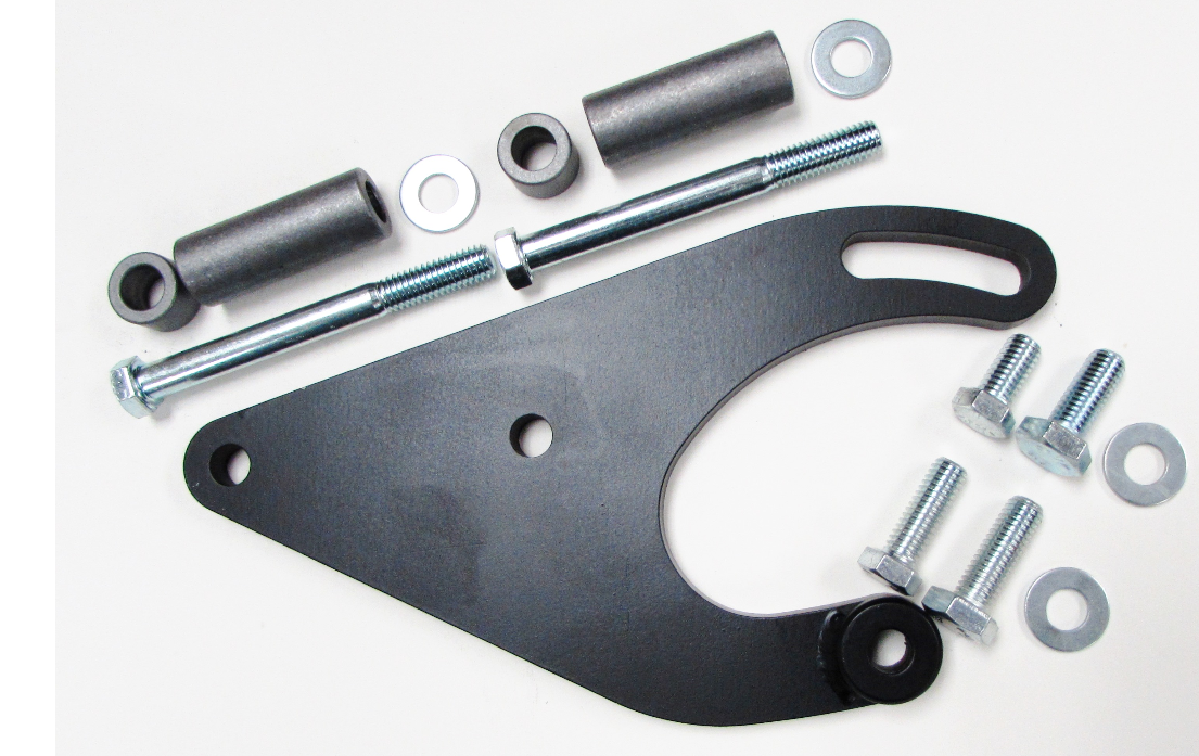 Power steering pump bracket for attaching a Saginaw style power steering pump to big block Ford FE 390/428 motors. Includes bracket and hardware for both Metric and SAE Saginaw self contained P/S pumps. Fits motors with and without A/C